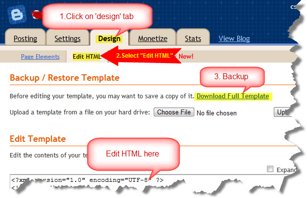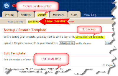 Now it’s easy to edit html of your blog’s template in blogger. Here in this post i will show you how to do so. Editing or changing your blog’s template is easy as copy and paste. For doing so, First of all, You login to your blogger account. Then you select ‘Design’ tab. Under ‘Design’ tab, you select ‘Edit HTML” option where you can edit or change your template’s HTML. And a very important thing to do before editing your template’s HTML is to backup the HTML of your present template.