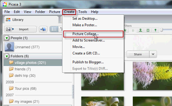1. Open Picasa and select “Picture collage” from “create” tab.