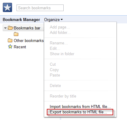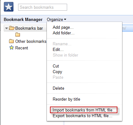 - Select “Import bookmarks from HTML file” and specify the file location. The bookmarks will be imported to your browser.