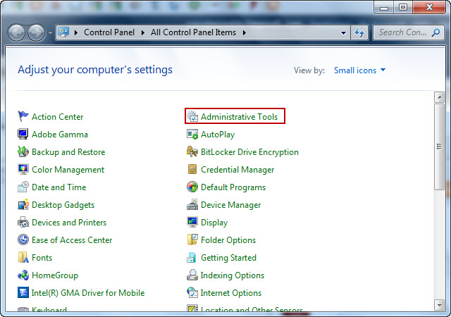 1. Open “Control Panel” and Select “Administrative Tools”. You can find it by changing the View to “Small icons or Large icons”.